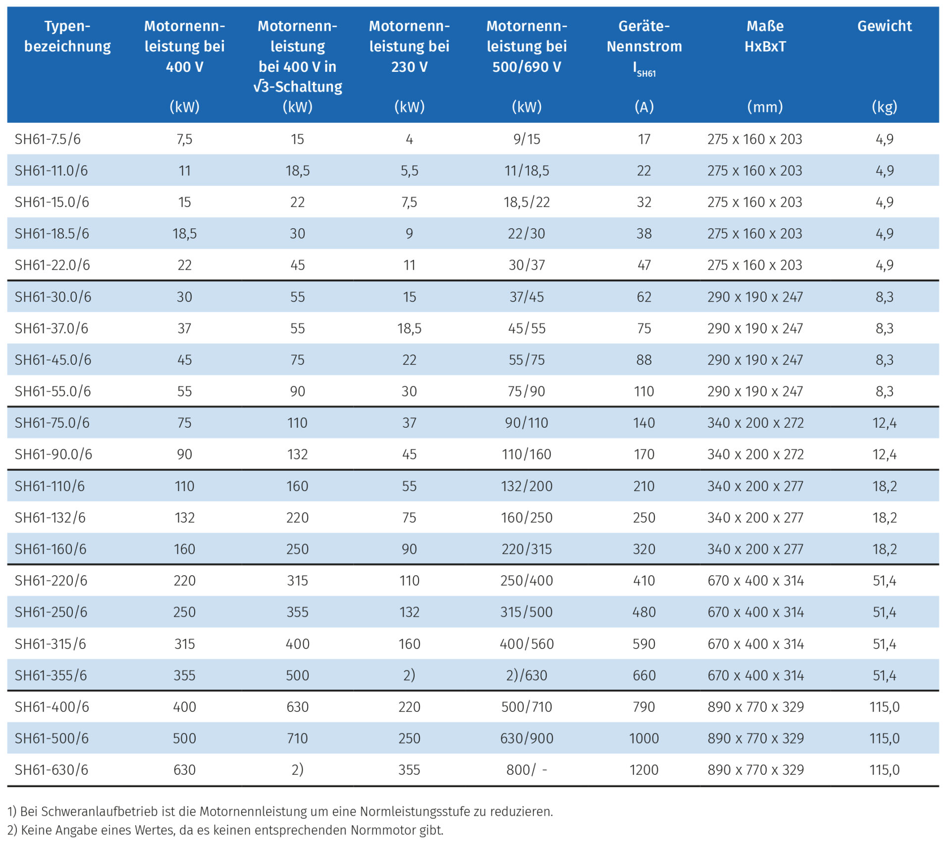 1) Bei Schweranlaufbetrieb ist die Motornennleistung um eine Normleistungsstufe zu reduzieren.